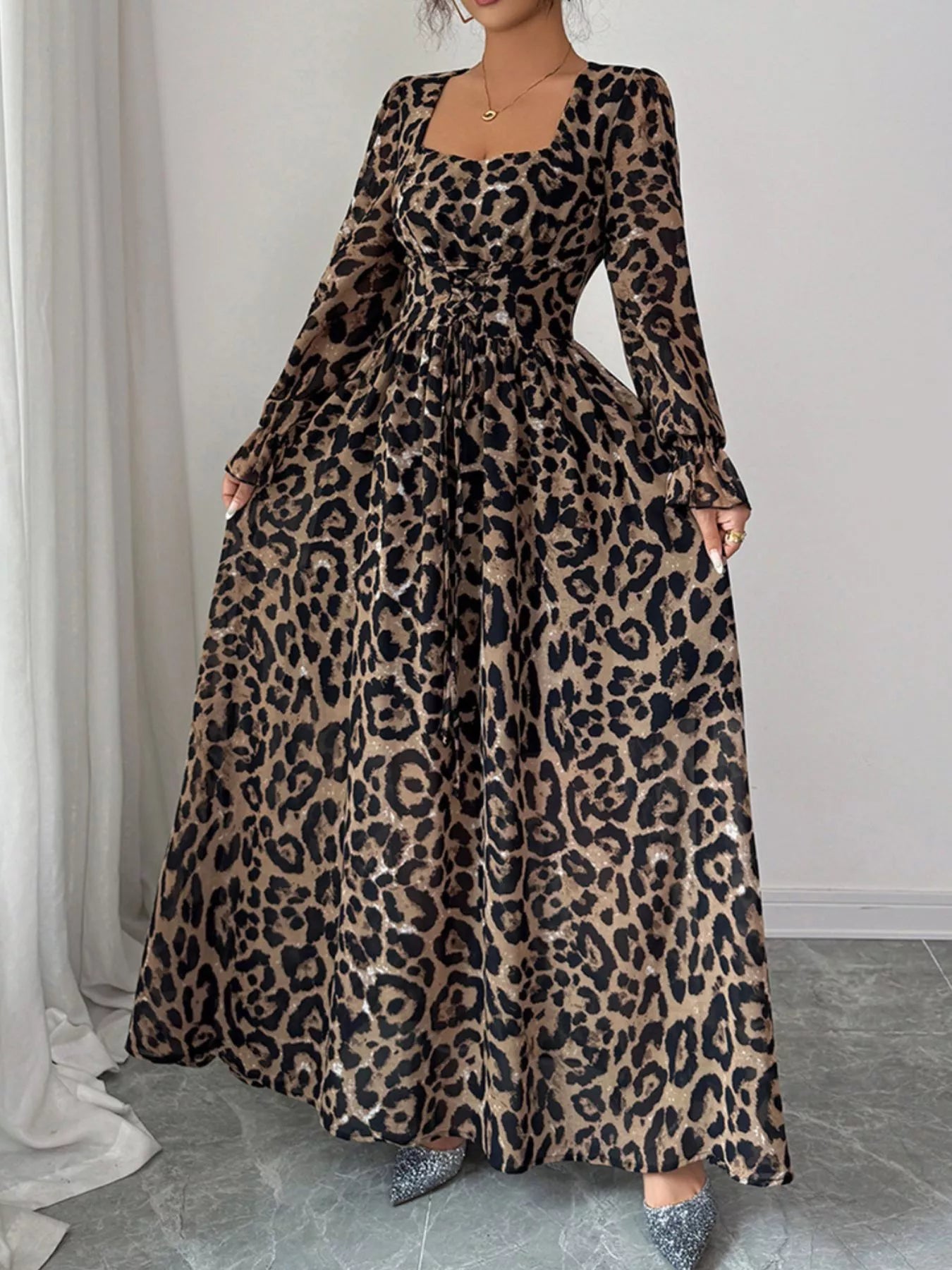 Leopard Sweetheart Neck Flounce Sleeve Maxi Dress