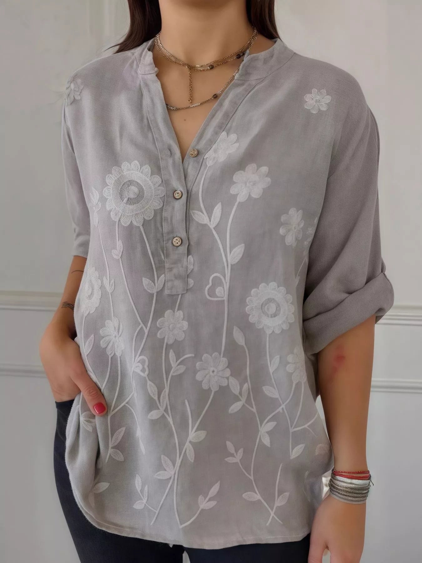 Full Size Floral Embroidered Button Detail Blouse Plus Size